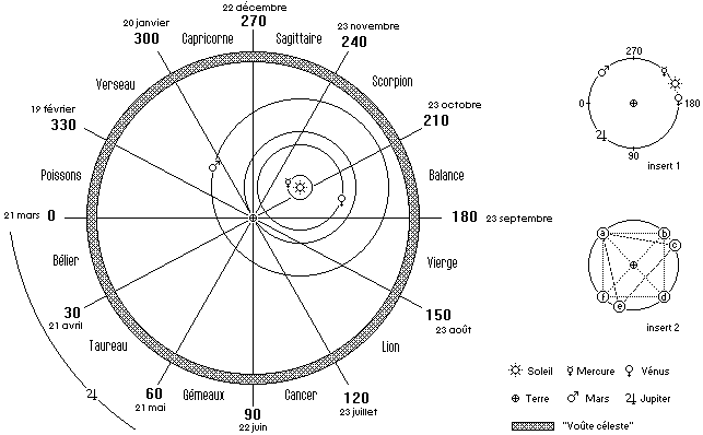 Si vous êtes versé dans le jargon astrologique relatif aux différents aspects, et si vous avez le coup d'œil astral, vous aurez peut-être remarqué que, sur la figure principale, Vénus et Mars sont « en opposition ». Bien vu ! À cela près que dans les représentations astrologiquement conformes (inserts 1 et 2), ces deux astres se trouvent « en trigone » - aspect, au dire des connaisseurs, particulièrement bénéfique.